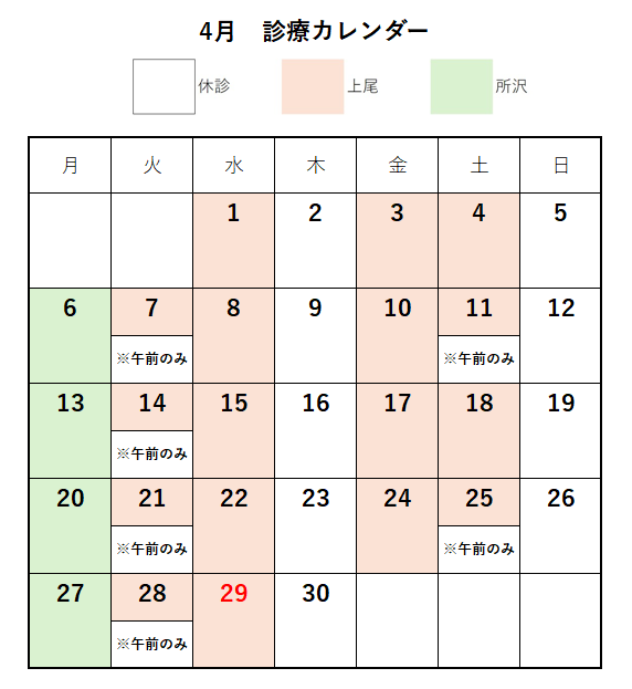 NEW! 4月の診療カレンダーです。カレンダーの診療日は、変更が出る場合もございますので、詳細はメールまたは電話でご相談ください。